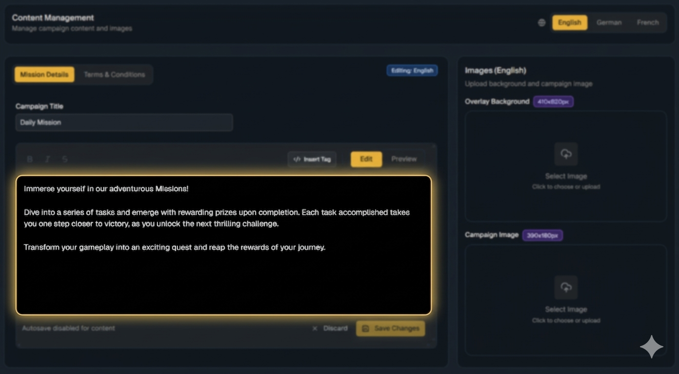 Adding content to a campaign ensures that players see clear, engaging, and accurate information within the campaign overlay. This guide explains how to configure titles, detailed info, images, and dynamic content for your campaigns.