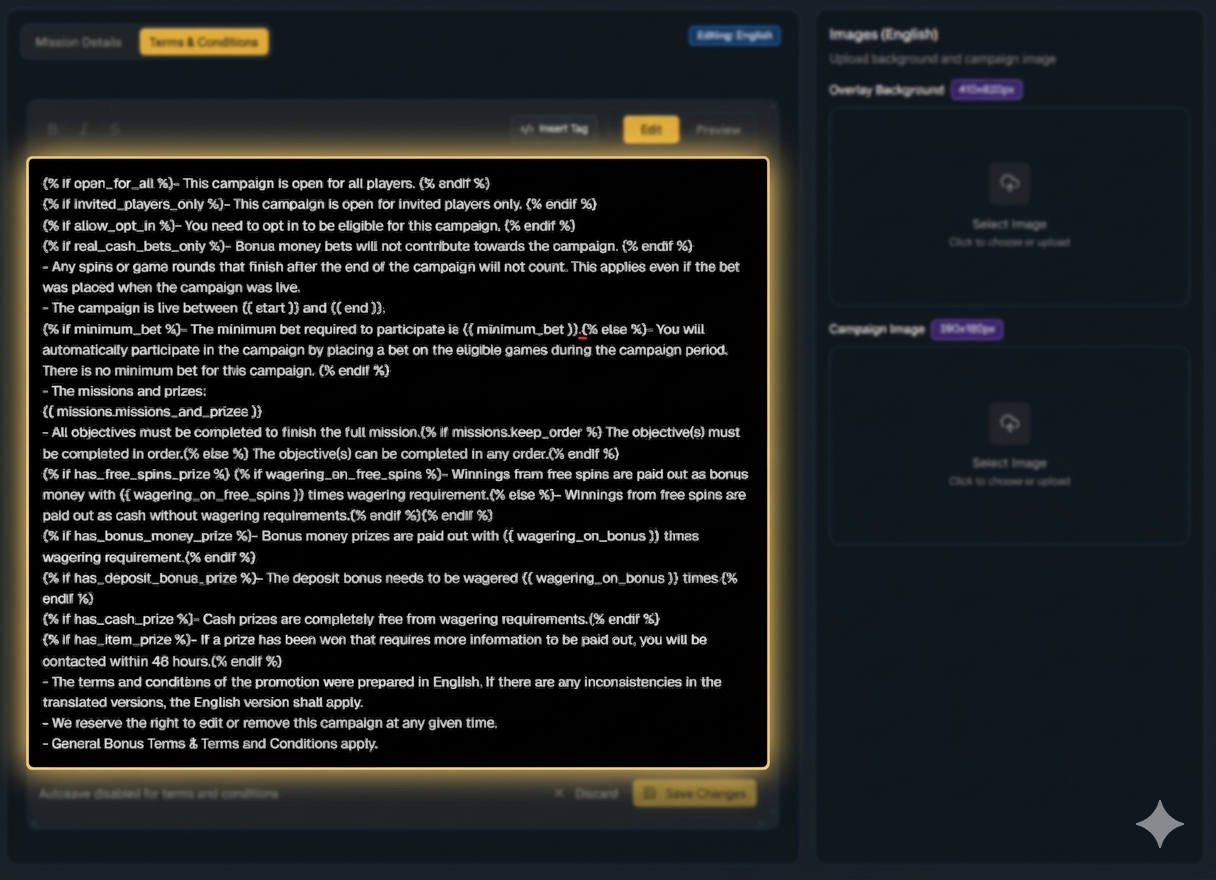 The Terms & Conditions are the rules and requirements players must follow to participate in the campaign. Use this field to clearly communicate all important restrictions, eligibility criteria, and wagering requirements so players understand how to participate correctly.
