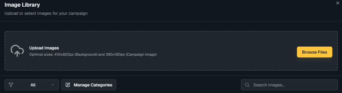 Use this section to upload background and campaign images that will be available for selection in your campaigns.
