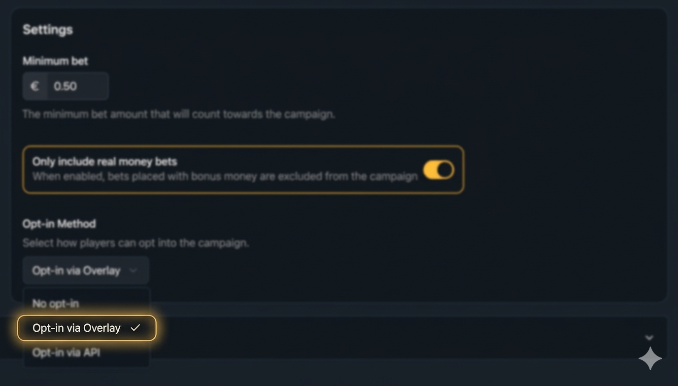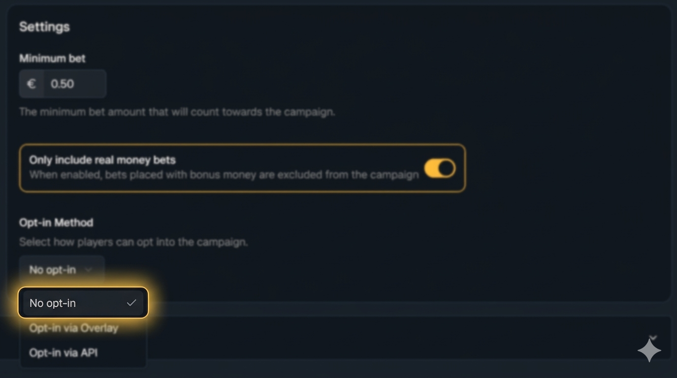 When creating or editing a campaign, in the General tab under Settings, users can manage the opt-in methods, which determine how players join the campaign.