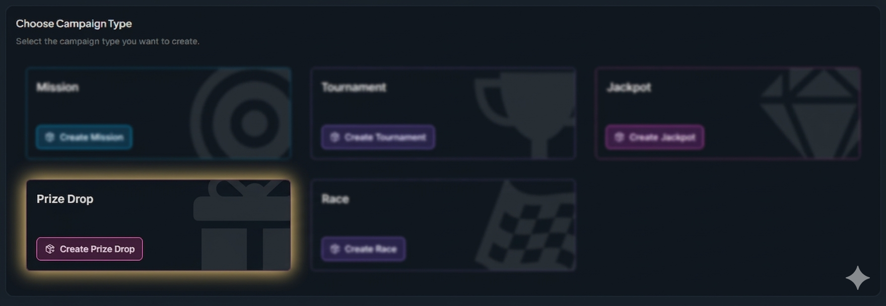 Click the button "+ Create Campaign" and choose the type 'Prize Drop'.